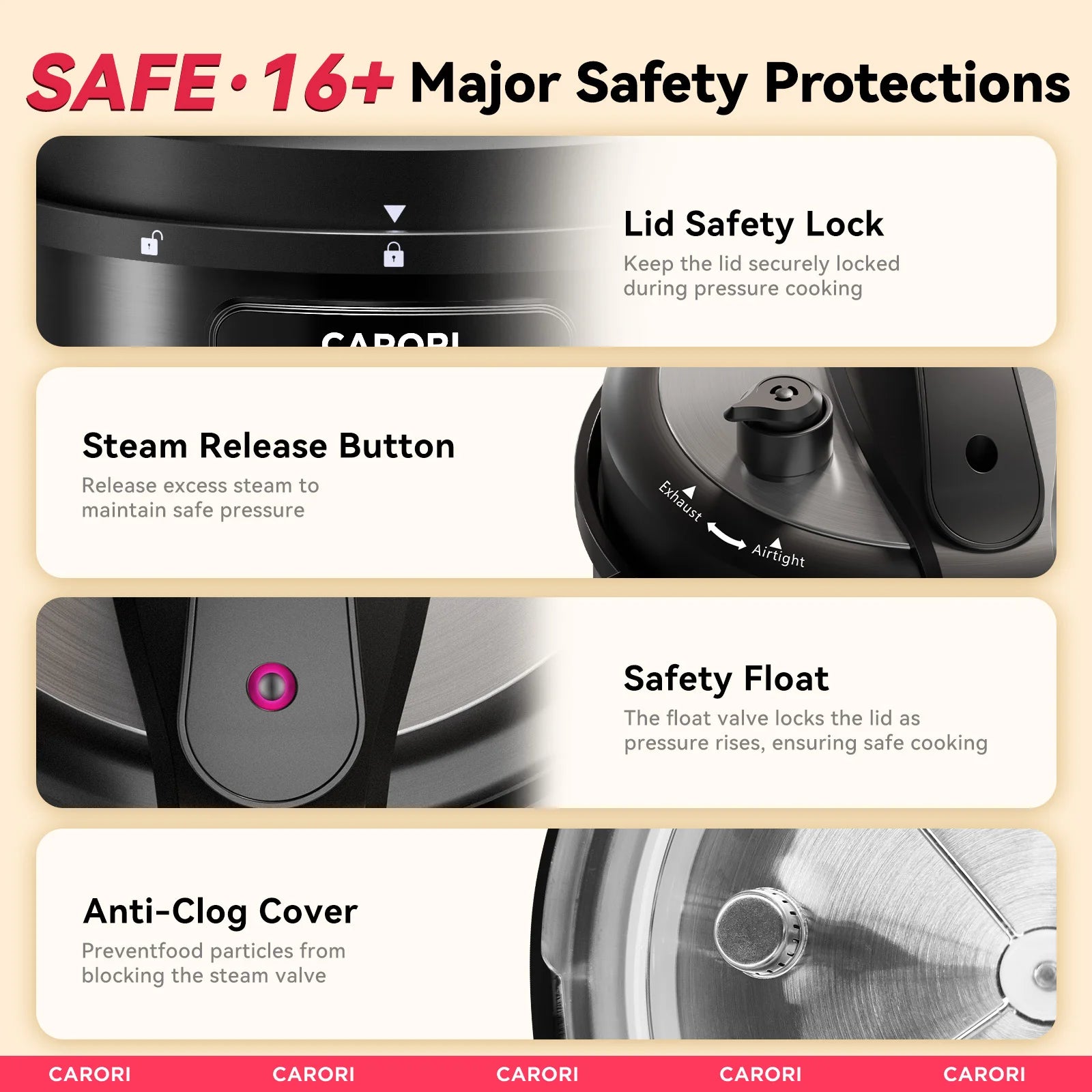 • 16+ Built-in Safety Features for Peace of Mind: Say goodbye to worries! With over 16 advanced safety features, including a steam release button, lid safety lock, overheat protection, leak-proof design, and pressure limit protection, this pressure cooker electric is designed to prioritize your safety.