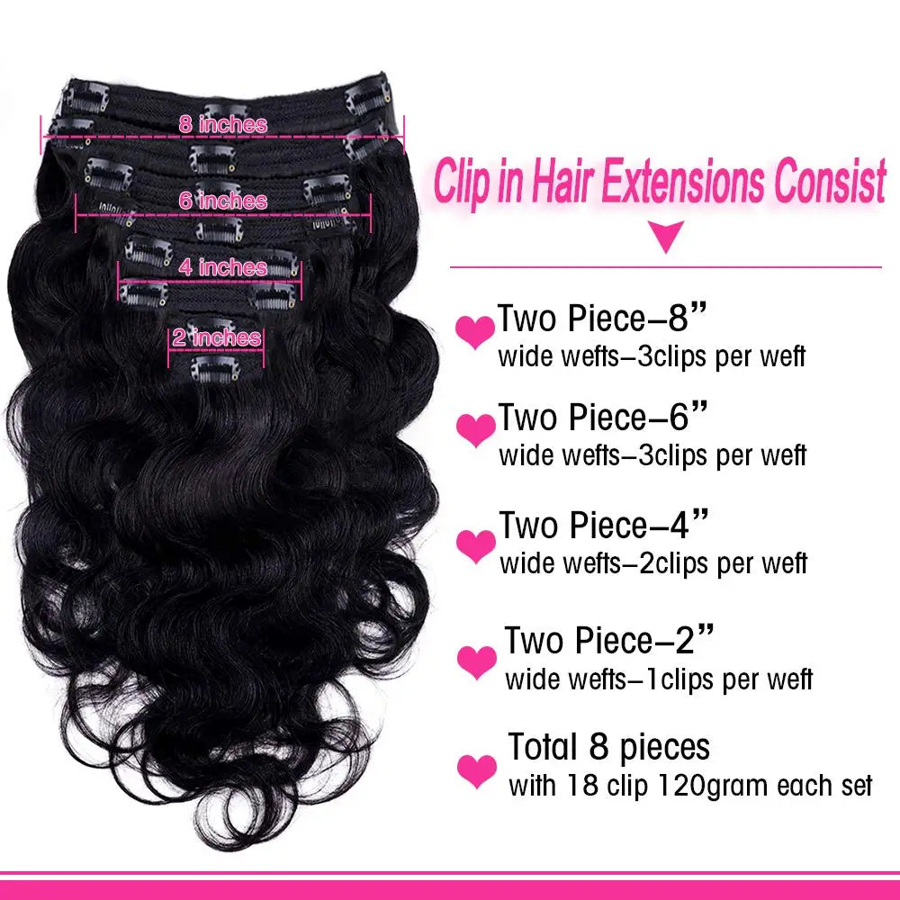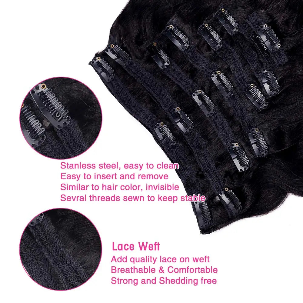 These 100% Human Hair Body Wave Clip in Hair Extensions feature a Double Weft for added durability. Made from premium quality Brazilian Hair, this set of 8 pieces weighing 120G is perfect for Black Women. With a vibrant #1B Pure Color, these Clip Ins can be permed and dyed to any desired shade.